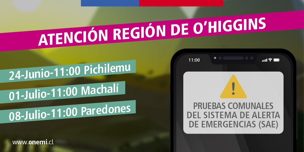 La Directora Regional de ONEMI O’Higgins, Alejandra Riquelme, señaló que “el 24 de junio realizaremos la primera prueba regional en la comuna de Pichilemu, mientras que el 1 de julio corresponderá a Machalí y el 8 de julio a Paredones, es importante recalcar que esto es solo una prueba del sistema, en ningún caso implica que las personas deban ejecutar alguna acción”.