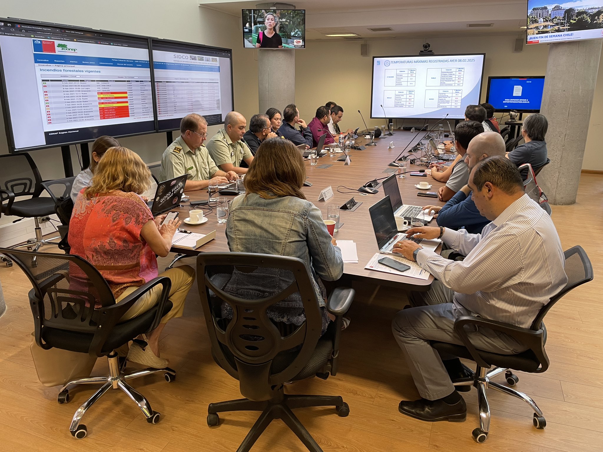 Durante esta mañana se realizó una nueva mesa técnica encabezada por la Directora Nacional de SENAPRED, Alicia Cebrián; y su homónima de la Corporación Nacional Forestal, Aída Baldini. La instancia contó con la participación de los organismos integrantes del Sistema Nacional de Prevención y Respuesta ante Desastres y se basó en la actualización de los pronósticos meteorológicos y en un análisis en detalle de la situación actual de los incendios forestales en nuestro país y de las acciones de respuesta que se han estado realizando durante la última jornada.