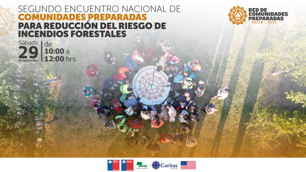 Este sábado 29 de noviembre a las 10:00 horas se realizará de manera telemática el “Encuentro Nacional de Comunidades Preparadas”. Esta red integra a organizaciones vecinales articuladas para contribuir a las tareas de prevención de incendios forestales, labor que ha sido apoyada e impulsada por la Corporación Nacional Forestal (CONAF), el Servicio Nacional de Prevención y Respuesta ante Desastres (SENAPRED), Cáritas Chile y el Programa Regional de Asistencia para Desastres (RDAP) del Gobierno de los Estados Unidos.